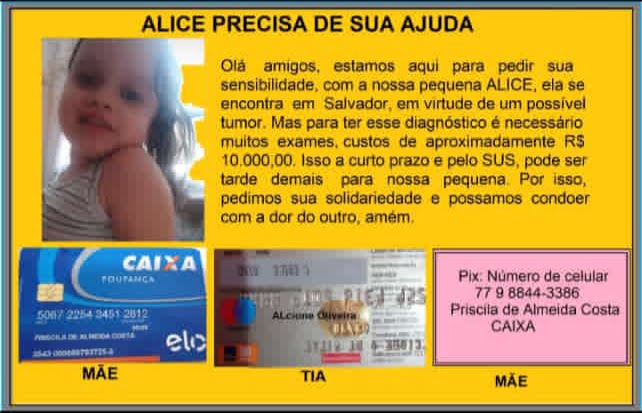 A pequena Alice de apenas 5 anos, está com um possível tumor, mas para esse diagnóstico é necessário muitos exames, com custos aproximadamente de R$10, 000,00, isso a curto prazo. Devido a extrema lentidão do atendimento através do SUS o estado de saúde de Alice pode se agravar.