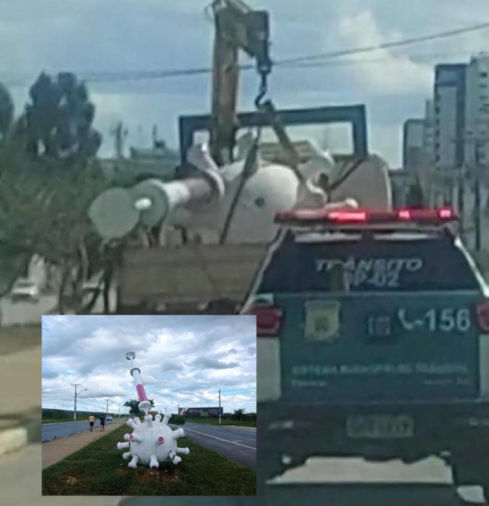 Conquista: Vídeo mostra Monumento bizarro do coronavírus sendo retirado da avenida Olívia flores