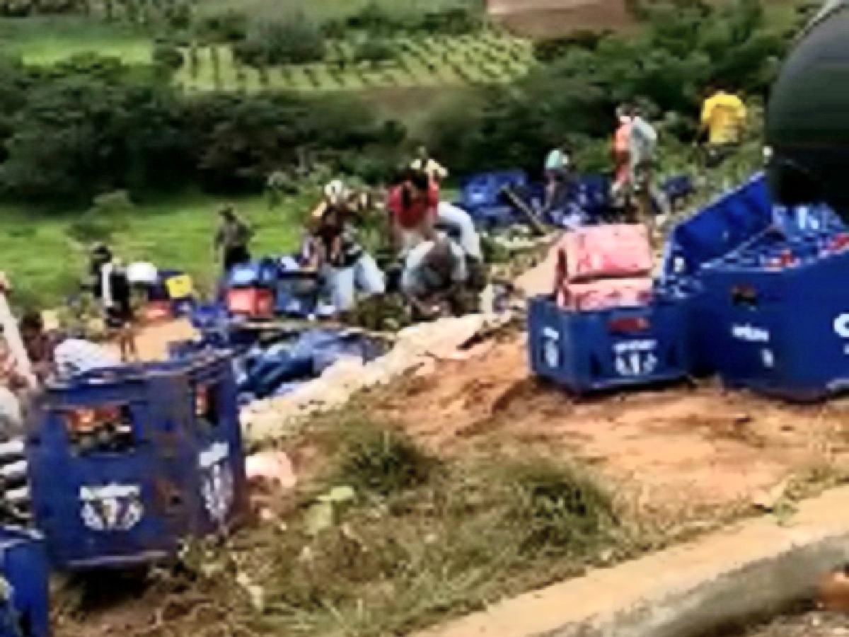 Caminhão tomba próximo a cidade de Licínio de Almeida na Bahia e carga de cerveja é saqueada dentro de poucos minutos