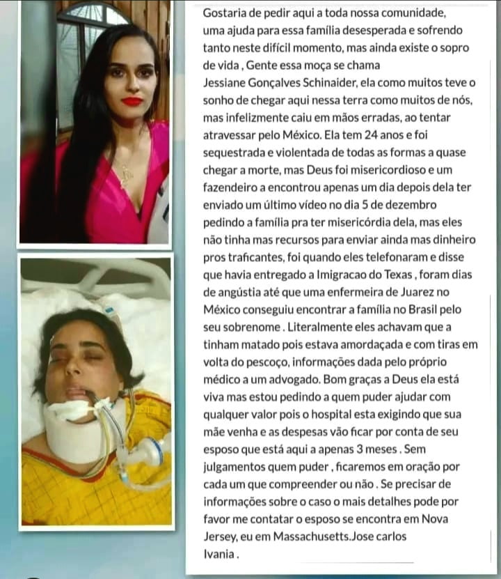 “Ela, como muitos, teve o sonho de chegar aqui nessa terra, mas infelizmente caiu em mãos erradas ao tentar atravessar pelo México”, afirma o texto. “Ela […] foi sequestrada e violentada de todas as formas a quase chegar à morte. […] Literalmente eles [os médicos] achavam que a tinham matado, pois [quando foi encontrada] estava amordaçada e com tiras em volta do pescoço.