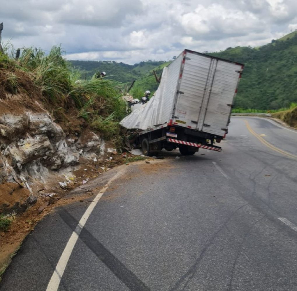 Um caminhão baú ficou destruído após bater contra uma parede de Rocha na estrada da serra do Marçal neste sábado (08).