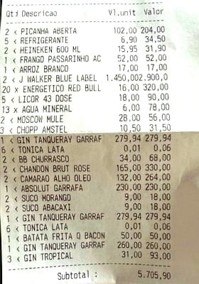 Ao final do dia, a conta ficou em R$ 5,7 mil em produtos, mais 10% da taxa de serviço, fechando em R$ 6,2 mil. Na comanda, havia duas garrafas de uísque de R$ 1,4 mil cada, mais de três de gin importado, além de pratos de picanha e camarão.