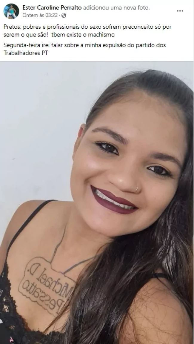 A atriz, Ester Caroline Perralto, conhecida populamente como tigresa, disse nas redes sociais que foi vítima de preconceito, após ter sua afiliação ao partido do PT barrada.