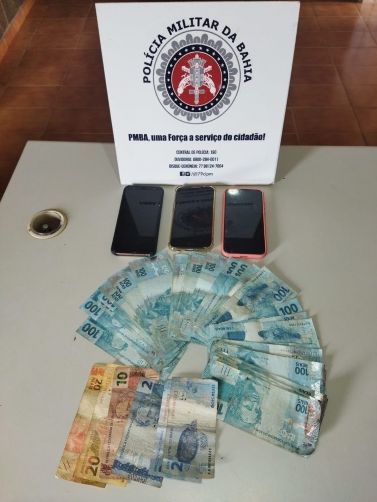 Com a mulher foi encontrado : R$6.656,00 (seis mil e cinquenta e seis) reais em espécie e três aparelhos celulares.