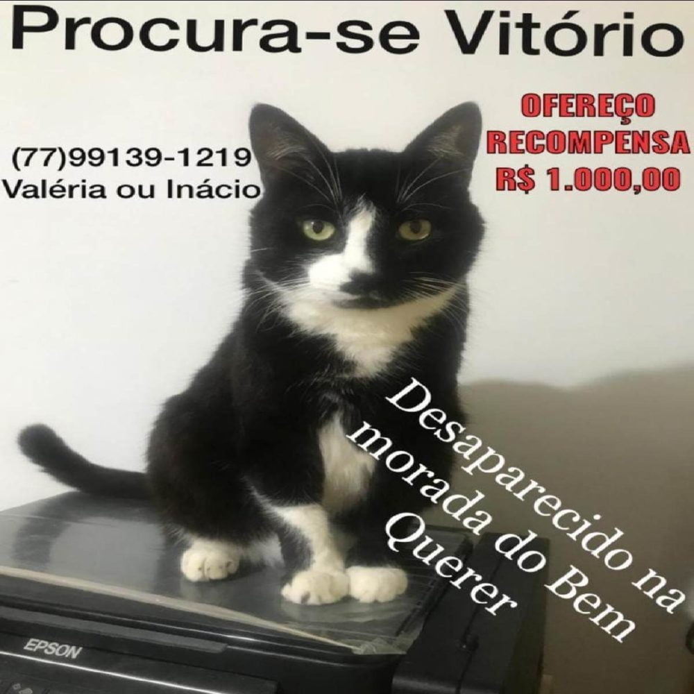 Uma recompensa de mil reais está sendo oferecida pra quem trazer o Vitório de volta pra casa. Fonte : Léo Santos