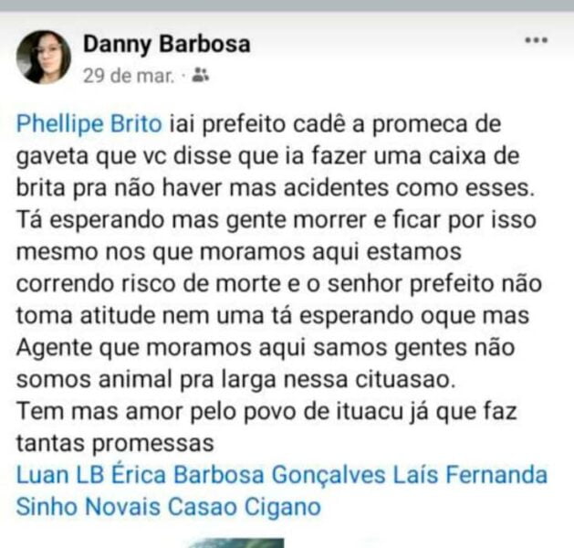 Há alguns meses atrás, Daniela já havia cobrando do prefeito para que tomasse alguma providência em relação a grande quantidade de acidente que estava acontecendo no local, mas nada foi feito. Veja o post da jovem na internet: