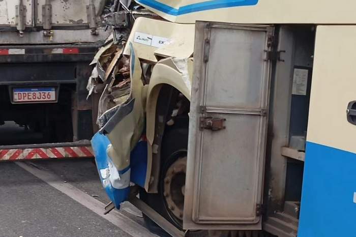 O acidente ocorreu quando o ônibus colidiu na traseira do caminhão, resultando na destruição da parte da frente do veículo de transporte coletivo.