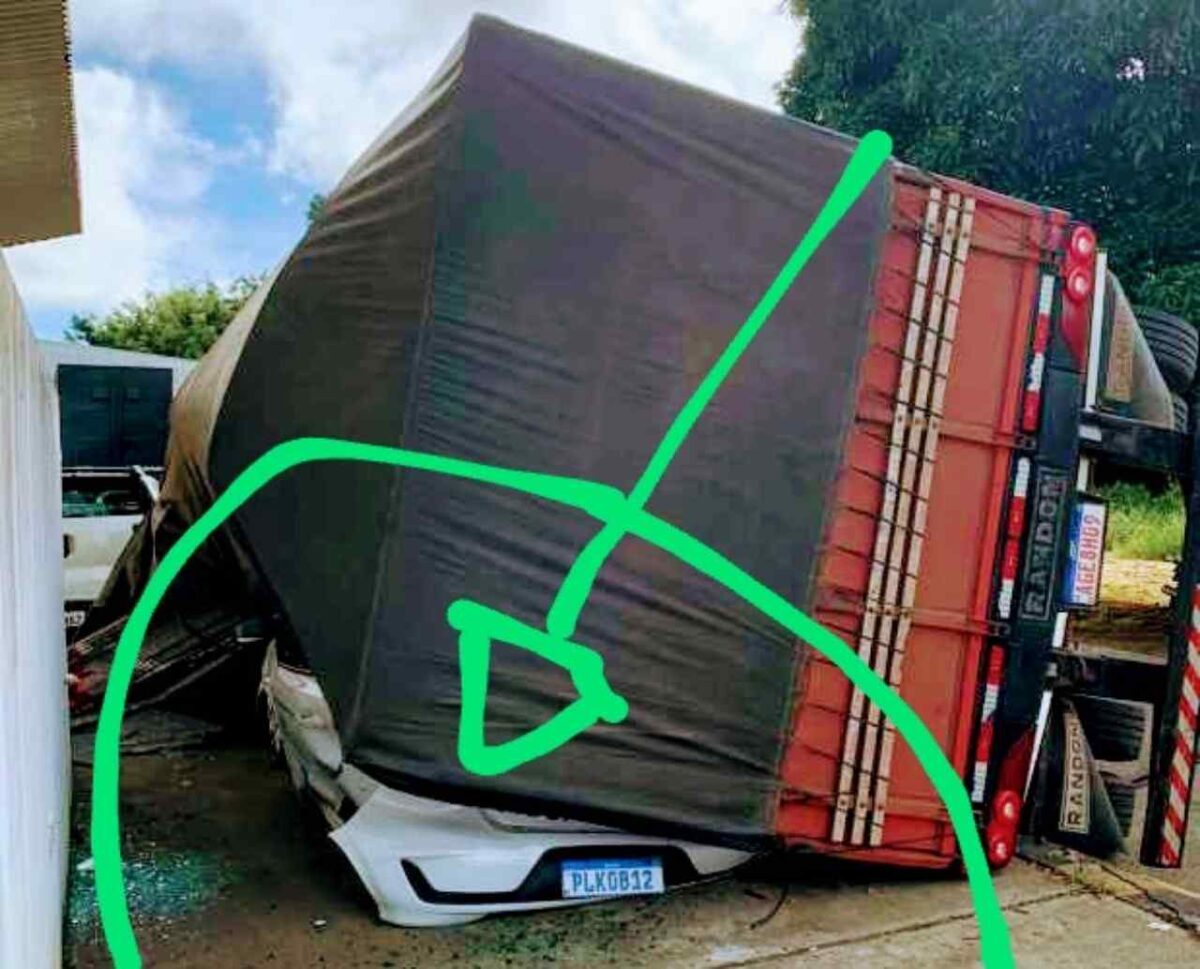 A carreta tombou de lado, caindo diretamente sobre o veículo de passeio. O impacto foi devastador, deixando o carro completamente esmagado sob o peso da carreta. VEJA O VÍDEO: