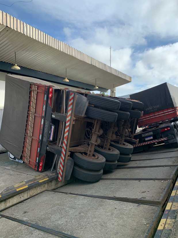 Carreta tomba e esmaga carro na balança de posto fiscal em Vitória da Conquista.