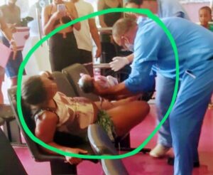 Testemunhas registraram o momento em que a mulher, deitada nos bancos da recepção, foi auxiliada por duas pessoas .
