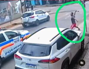 As imagens mostram a viatura parada em uma via, aguardando o sinal verde no semáforo. O homem, que estava na calçada, pega uma garrafa, caminha em direção ao veículo, corre brevemente e arremessa o objeto contra o para-brisa. Em seguida, um policial desce do carro e aborda o suspeito, que não apresenta resistência.
