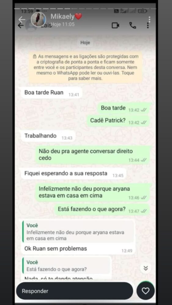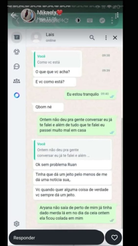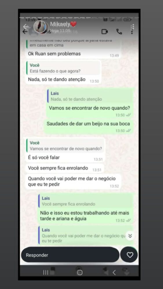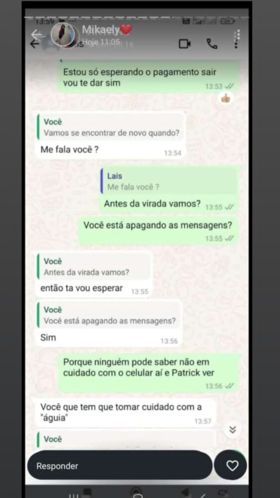 Aryana acusou o pastor de ter um relacionamento com uma integrante da igreja, identificada como Laís Silva, que também é casada. Durante o culto, Aryana pegou o microfone e, diante da congregação, detalhou a descoberta: “Hackeei o celular do meu marido e vi as mensagens dele com a levita Laís. Quem quiser, estão aí os prints. VEJA OS PRINTS: