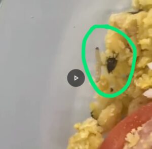 Nas imagens, compartilhadas amplamente na internet, é possível ver um prato de comida com a larva.