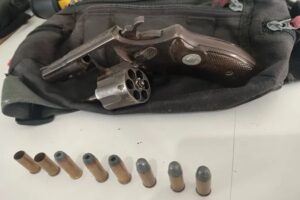 Ao se aproximar, os policiais constataram que se tratava de uma pochete contendo um revólver Taurus, calibre .32, com seis cartuchos intactos e dois deflagrados. A arma estava pronta para uso, indicando uma possível intenção criminosa por parte do indivíduo.