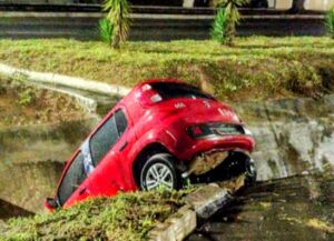 De acordo com informações apuradas, o veículo subiu no canteiro central antes de despencar parcialmente no canal. A cena chamou a atenção de quem passava pelo local, que se assustou com a gravidade da situação.