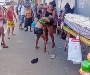 No registro, é possível ver a agressora puxando a vítima pelos cabelos e desferindo golpes, enquanto pessoas ao redor tentam intervir.