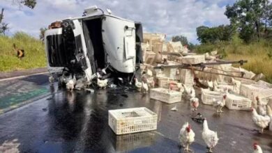 Caminhão carregado com galinhas tomba após colidir com carga de outro caminhão tombado
